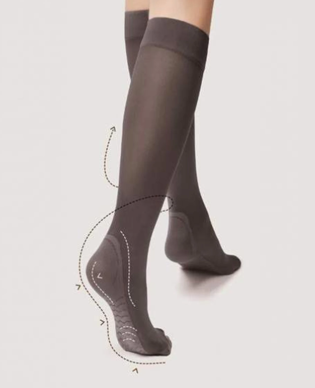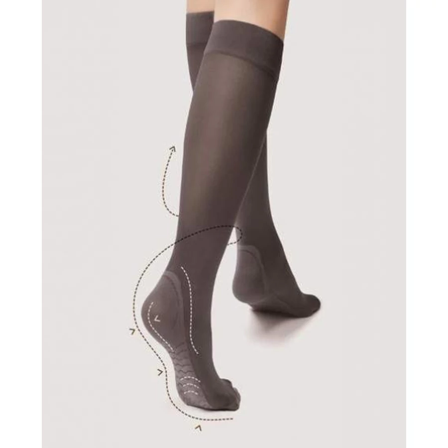 Ez a nyomásmentes térdharisnya a klasszikus elegancia és a hihetetlen kényelem szokatlan kombinációja , amely az elegancia mellett megkönnyebbülést és kényelmet biztosít a lábak számára. Az anyag láb alja körüli elhelyezésének speciális technológiája azt eredményezi, hogy egy gyengéd talpmasszázs hatását tapasztaljuk meg. Tökéletesek az irodába, de a vérkeringési problémákkal küzdők számára is. Hihetetlenül univerzálisak, aminek köszönhetően minden alkalomra tökéletesek lesznek. Különösen ajánlott keringési problémákkal küzdőknek, terhes nőknek, repülővel utazóknak, valamint álló és ülve dolgozóknak. Egész napos regenerációt biztosítanak a fáradt lábaknak és ellazítják a lábfejet.